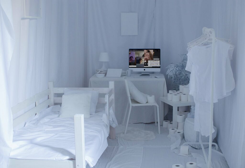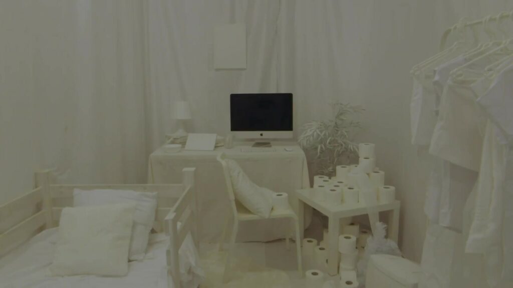 Praca dyplomowa "Izolacja" - składa się z dwóch głównych elementów, które reprezentują świat rzeczywisty i wirtualny. Jest to fizyczna scenografia pokoju oraz montaż zgromadzonego i przygotowanego przeze mnie materiału wideo, nagrywanego przez rok życia w pandemicznej rzeczywistości.