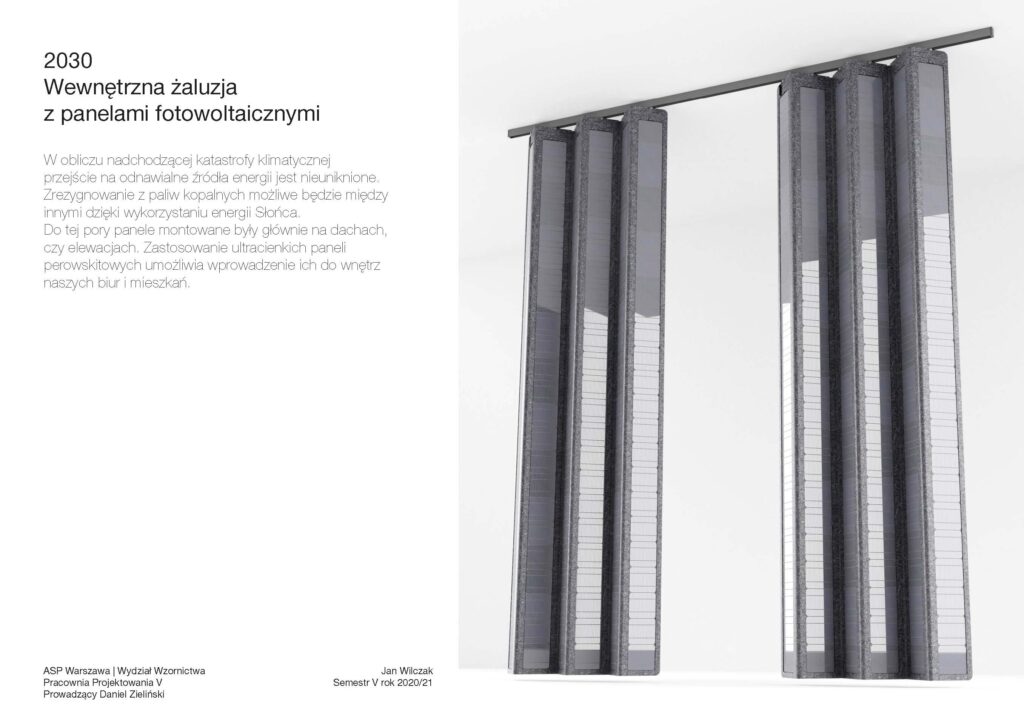 Projekt wewnętrznych przesłon okiennych gromadzących energię elektryczną i pozwalających na regulację ilości wpadającego do wnętrza światła.