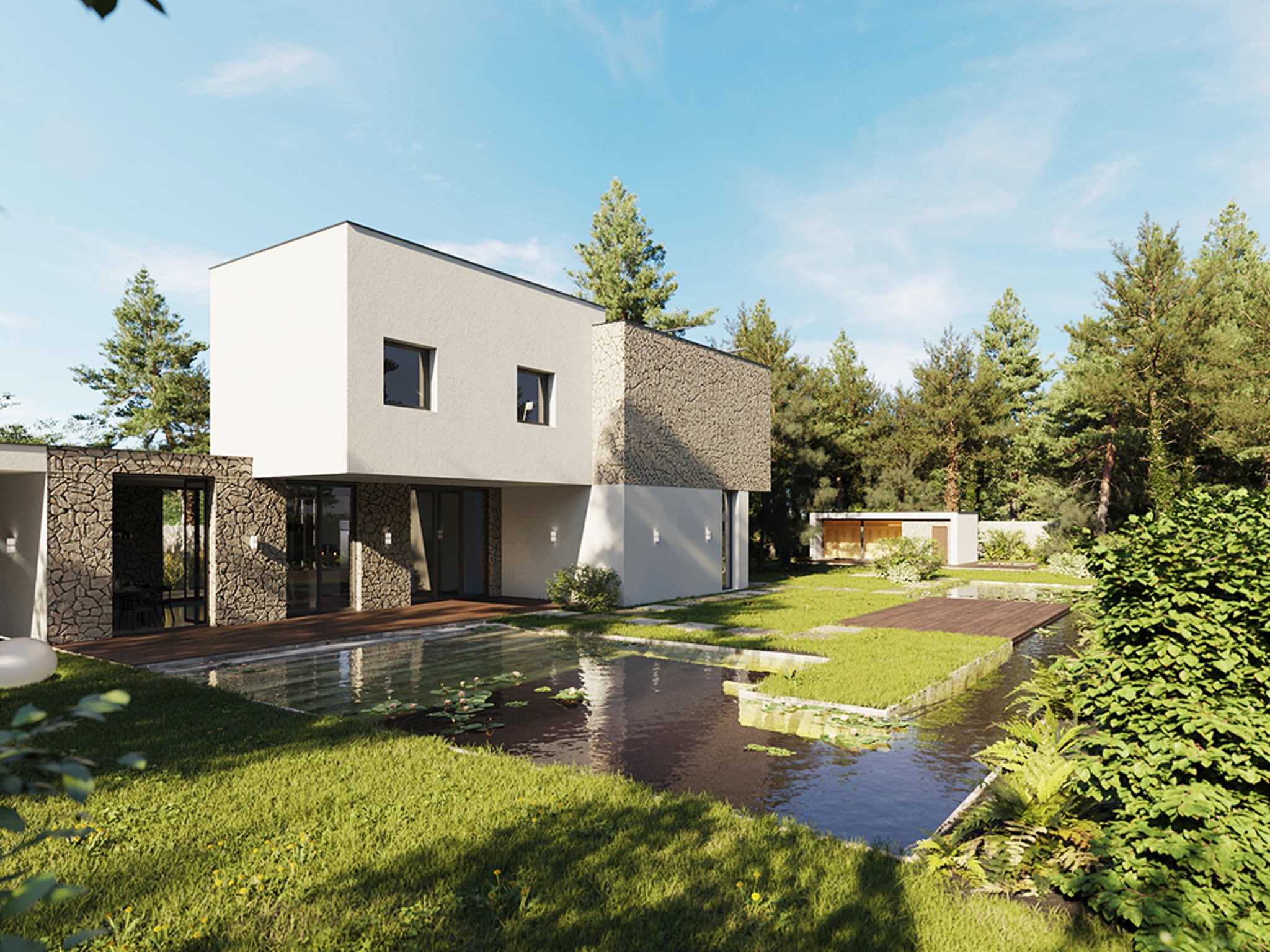 Projekt ogrodu domu jednorodzinnego w Kaliszkach powstał w wyniku inspiracji otaczającym krajobrazem (ukształtowanie terenu, okoliczne lasy sosnowe) oraz stylem formy architektonicznej domu. Większość proponowanych rozwiązań programowych takich jak naturalny staw kąpielowy, zielony dach, roślinność, charakteryzuje się prośrodowiskowym podejściem do kształtowania środowiska.